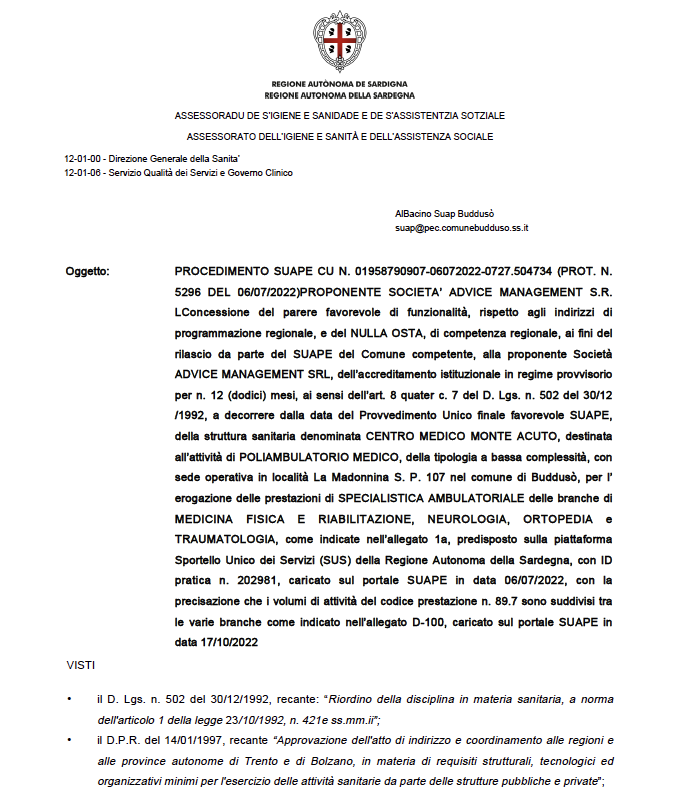 La struttura sanitaria denominata Centro Medico Polispecialistico Monte Acuto ha recentemente ottenuto l’accreditamento istituzionale in regime provvisorio da parte dell’Assessorato dell’Igiene e della Sanità per n.12 (dodici) mesi, ai sensi dell’art. 8 quater c. 7 del D. Lgs. n. 502 del 30/12 /1992, a decorrere dal 27.10.2022, destinata all’attività di POLIAMBULATORIO MEDICO, della tipologia a bassa complessità, con sede operativa in località La Madonnina S. P. 107 nel comune di Buddusò, per l’erogazione delle prestazioni di SPECIALISTICA AMBULATORIALE delle branche di MEDICINA FISICA E RIABILITAZIONE, NEUROLOGIA, ORTOPEDIA e TRAUMATOLOGIA attualmente in fase di convenzionamento.
